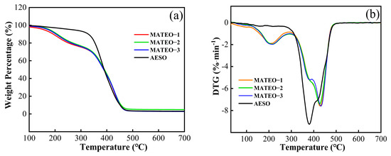 (a) TGA and (b) DTG curves of MATEO and AESO cured coating films.