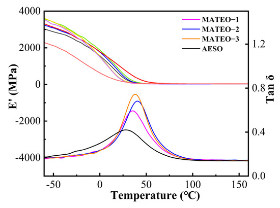 The dynamic thermomechanical properties of the MATEO and AESO cured films were investigated by a DMA analyzer. The energy storage modulus (E′) and loss coefficient (tan δ) curves of the MATEO and AESO cured films are plotted in Figure 6. The maximum peak in the tan δ curve is related with the glass transition temperature (Tg) of the cured films. As seen from Figure 6, there is only one tan δ peak and Tg peak in all the cured films, which indicates the good compatibility of the cured films. While the stiffness of the cured films can be evaluated by E′25, the thermodynamic behavior is closely related to the crosslinking degree. According to previous research, the crosslinking degree has an influence on the crosslinking characteristics of the cured film: as the temperature rises, the mechanical strength of the cured film gradually increases [16]. According to the theory of rubber elasticity, the crosslink density (Ve) of the cured film can be calculated using the following formula: