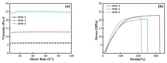 Rheological viscosity curves of (a) IPM resins; (b) stress–strain curves of IPM cured coating films.