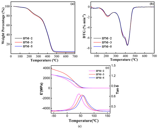 The TGA, DTG, energy storage modulus and loss factor curves of the cured films are shown in Figure 8a,b. It could be observed that the TGA and DTG curves of all IPM cured films showed the same trend, which mainly included two thermal degradation stages. The first stage mainly occurred between 160 and 300 °C, which was mainly due to the mass loss caused by photoinitiator 1173, the catalyst and trace isocyanate residues. The second stage occurred between 300 °C and 480 °C, which was mainly due to the long carbon chain structure and carbonization. And the specific data of the T10%, T50% and residual carbon rate are shown in Table 6. There is no significant difference in the mass loss of the cured films except for the IPM-5 film, which has a residual carbon rate of 4.14%. The T10% values of the three IPM cured films are around 217 °C, and the T50% values are between 386 and 389 °C, indicating that the addition of isocyanate does not affect the thermal stability of the IPM cured films. The maximum decomposition temperature of the IPM cured films appeared around 420 °C, which showed the favorable thermal stability of the IPM cured films.