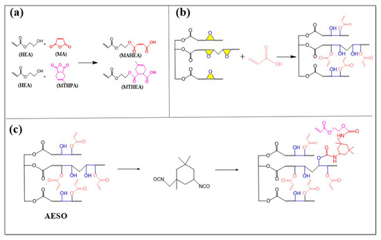 Synthesis routes of (a) anhydride derivatives; (b) epoxidized soybean oil-based acrylic photosensitive resin (MATEO) and (c) photosensitive polyurethane resin (IPM).