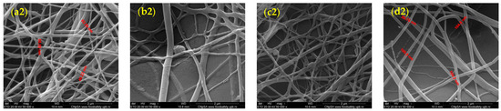 SEM images recorded for PET@ZnO at various deposition rates, where (a1,2)—2.5 mL/h; (b1,2)—5 mL/h; (c1,2)—7.5 mL/h; (d1,2)—10 mL/h.