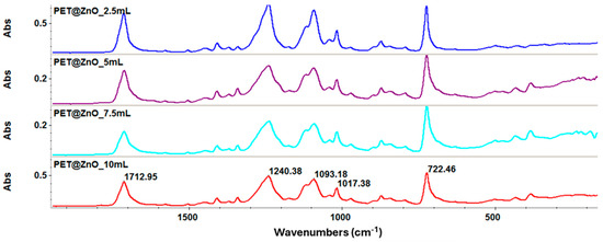 FT-IR spectra recorded for the PET@ZnO-type membranes.