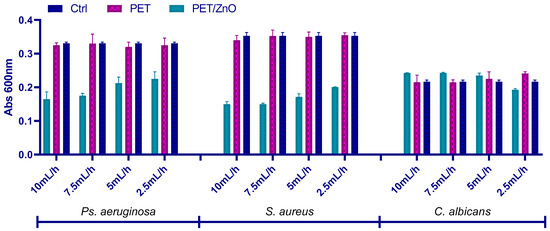 Absorbance values for Ps. aeruginosa, S. aureus, and C. albicans cultures, showing cell growth after 24 h in the presence of recycled PET@ZnO membranes.