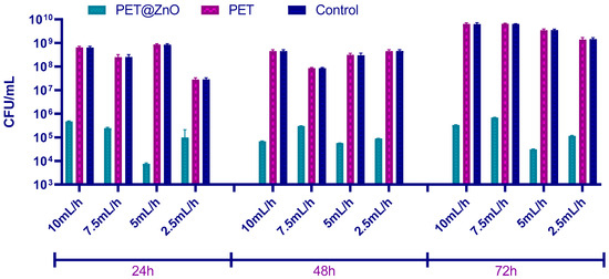 In the evaluation of biofilm formation, the results showed a significant reduction in the ability of S. aureus to form biofilms on the surfaces of PET membranes containing ZnO nanoparticles compared to plain PET and control samples (Figure 6). This inhibitory effect was consistent across all stages of biofilm development, including initial cell adhesion (24 h), biofilm maturation (48 h), and the dispersion phase (72 h), as illustrated in Figure 7. The PET@ZnO membranes demonstrated a substantial reduction in CFU/mL values at all time points, indicating their effectiveness in limiting bacterial colonization and biofilm growth.