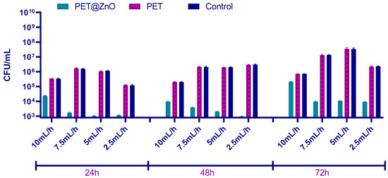 The results of this study demonstrate that the ability of this microorganism to form biofilms was significantly reduced on nanostructured PET materials containing ZnO. As shown in Figure 7, the PET@ZnO samples displayed a marked inhibitory effect across all three time intervals—24, 48, and 72 h—when compared to plain PET and control samples. At 24 h, the PET@ZnO membranes effectively limited initial biofilm formation, as indicated by the lower CFU/mL values. This inhibitory trend continued through the biofilm maturation phase (48 h) and the dispersion stage (72 h), where cell clusters typically detach to colonize new surfaces. In contrast, plain PET and control materials consistently supported extensive biofilm growth, as evidenced by the higher bacterial counts observed throughout the experiment.