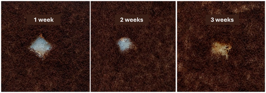 Appearance of A. niger cultures developed in the presence of the nanostructured PET@ZnO membranes, deposition rate 5 mL/h, over 1, 2, or 3 weeks.