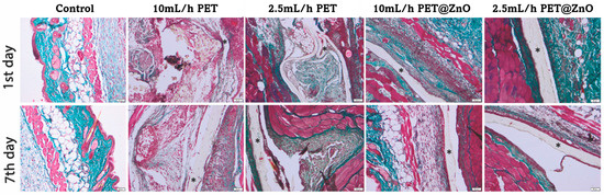 The in vivo study was conducted using CD1 mice provided by the Animal Facility of Vasile Goldis Western University of Arad. The experimental protocol was reviewed and approved by the University’s Research Ethics Commission. CD1 mice were housed in cages with regulated airflow and maintained on a standard 12-h light/dark cycle. Pre-sterilized materials (UV for 30 min) were implanted subcutaneously in the dorsal region under intraperitoneal anesthesia of 100 mg/kg b.w. Ketamine hydrochloride and 10 mg/kg b.w. Xylazine hydrochloride. Mice were randomly assigned to five experimental groups (n = 20 each): control animals with skin incision but without an implant, a group of mice implanted with 2.5 mL/h PET, a group of mice implanted with 10 mL/h PET, a group of mice implanted with 2.5 mL/h PET@ZnO, and a group of mice implanted with 10 mL/h PET@ZnO. Within each group, half of the mice were euthanized at 24 h post-surgery and the remaining half at 7 days post-surgery. Following implantation, mice were housed individually. A veterinarian conducted daily clinical examinations, assessing the surgical incision for appearance, redness, infection, edema, abscess, hematoma, and scarring. Biopsies were taken at 24 h and 7 days post-surgery under anesthesia [14,15].