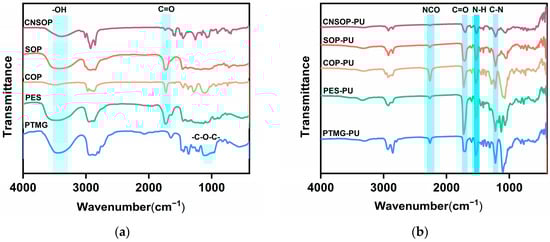 FTIR spectra of polyols before and after the reaction. (a) FTIR spectra of polyols; (b) FTIR spectra of the corresponding polyurethanes derived from the polyols.
