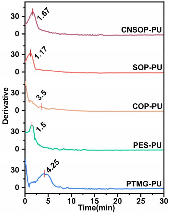 To further explore the relationship between curing behavior and system temperature, the derivative of the temperature–time curve shown in Figure 4 was calculated, yielding Figure 6. As shown in the graph, the peak values of the differential curves closely align with their respective gel times. Specifically, the gel point for each sample corresponds to the maximum temperature change within the given time interval. At this stage, the hydroxyl groups and isocyanates undergo progressive polymerization, leading to crosslinking within the system. This results in a sharp increase in viscosity, making the system more resistant to flow. Consequently, the material transitions into a gel-like state, hindering the rise of internal bubbles.
