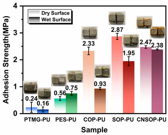 Figure 11 displays the adhesion strengths of polyurethane samples on dry and wet mortar substrates after a 7-day curing period, highlighting the performance of different polyurethanes for underwater applications. Adhesion tests on five sample sets show that bio-based polyurethanes generally exhibit better adhesion than conventional polyurethanes derived from polyether and polyester polyols. PTMG-PU exhibited the lowest adhesion strength due to its low crosslinking density, with dry and wet adhesion strengths of only 0.24 MPa and 0.16 MPa, respectively. PES-PU showed slightly higher adhesion on dry surfaces and a notable increase in wet adhesion strength, from 0.56 MPa to 0.75 MPa. This improvement can be attributed to the better wetting properties of polyester polyols on wet substrates, as shown in Figure 13, allowing for greater diffusion into the mortar’s capillary pores and increasing the effective bonding area. COP-PU showed the most significant reduction in adhesion strength, decreasing by 60%, from 2.33 MPa to 0.93 MPa. The slow reaction rate of castor oil-modified polyols, combined with side reactions during underwater curing that produce CO2 gas, reduces the effective bonding area. Additionally, some isocyanate groups undergo side reactions, leaving hydroxyl groups unreacted, which prevents full crosslinking of the polyol segments, further lowering adhesion strength. Consequently, the failure mode shifted from internal concrete failure to interface failure between the polyurethane and mortar. In contrast, SOP-PU and CNSOP-PU both exhibited adhesion failure primarily within the concrete matrix. SOP-PU had the highest dry adhesion strength at 2.87 MPa, but its wet adhesion strength decreased to 1.95 MPa, with a loss rate of 32%. As shown in Figure 13, the soy oil-modified polyol displayed limited spreading on the wet mortar surface, indicating poorer wettability. This reduced diffusion into the mortar’s capillary pores and diminished mechanical anchoring, leading to a decline in adhesion strength. CNSOP-PU exhibited the smallest loss in wet adhesion strength, with only a 3.6% decrease, yielding dry and wet adhesion strengths of 2.47 MPa and 2.38 MPa, respectively. In conclusion, bio-based polyurethanes generally show superior adhesion performance, with cashew nut shell oil-based polyurethane demonstrating the best wet adhesion, making it a promising candidate for underwater applications.