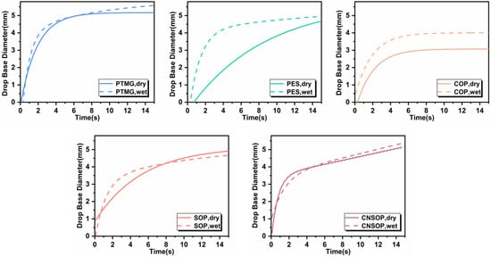 During underwater casting, thoroughly mixed polyol and isocyanate components flow through water to reach the injection site. The interaction between the slurry and water molecules determines the extent of water bonding to the slurry []. Fewer water molecules binding to the droplet surface result in lower water content in the final reaction mixture, thereby minimizing side reactions between isocyanate and water. Additionally, the slurry’s wetting behavior and its spreading characteristics on both dry and wet substrates significantly influence the material’s performance. To assess the interaction between polyols and water during the casting process, the interfacial tension between polyol and water was measured, providing an estimate of water content in different systems under underwater casting conditions. Moreover, changes in the wetting diameter of slurry droplets on a mortar substrate over time were observed, with the wetting rates on both dry and wet surfaces compared. This approach provides insights into the hydrophobicity of samples and their wetting behavior on substrates.