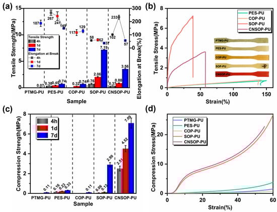Figure 14 presents the tensile and compressive properties, along with the stress–strain curves, of five samples at different time intervals. PTMG-PU, due to its slow reaction rate at room temperature, showed only a weak strength after 7 days. PES-PU exhibited an increase in tensile strength over time, with a decrease in elongation at break. After 7 days, its tensile strength was 0.74 MPa, and the elongation at break was 149%, indicating continued curing and the formation of stronger urethane or urea bonds. This process likely increased hydrogen bonding and crosslinking density, leading to reduced elongation. These two samples displayed lower strength, likely due to their low functionality and crosslinking density. COP-PU, which contains ester bonds, exhibited slightly higher strength than PTMG-PU due to the increased cohesive energy and polarity of ester bonds, enabling more hydrogen bonding. However, due to its low reactivity, COP-PU formed poorly in the early stages, resulting in numerous bubble defects in the cured product, and its tensile strength after 7 days remained at 0.74 MPa. SOP-PU exhibited the highest tensile strength among all five polyol-based samples, reaching 7.18 MPa after 7 days. The superior mechanical properties of SOP-PU can be attributed to the high reactivity and functionality of the soybean oil-modified polyol, which facilitates greater crosslinking and stronger intermolecular interactions between hard segments. This results in enhanced mechanical properties and minimized side reactions during curing, reducing pore defects in the final product. The high tensile strength of SOP-PU may also stem from the larger molecular weight and complex branching of the soybean oil-modified polyol, which increases the number of polymer chains that break during stretching, further improving tensile strength. CNSOP-PU was soft and weak at 4 h but showed improved tensile strength and elongation at break after 1 day, indicating ongoing chain extension and crosslinking. After 7 days, the tensile strength reached 3.56 MPa, with an elongation at break of 57%. Compressive tests revealed that CNSOP-PU exhibited the highest compressive strength, reaching 7.09 MPa after 7 days, followed by SOP-PU at 2.90 MPa. The increased rigidity of the molecular chain in CNSOP-PU, due to the presence of phenyl rings in the cashew nut shell oil-based polyol, contributed to its superior mechanical performance.