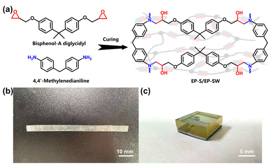 (a) Schematic illustration of preparation of the epoxy resin. (b) Image of EP-S. (c) Image of EP-SW.