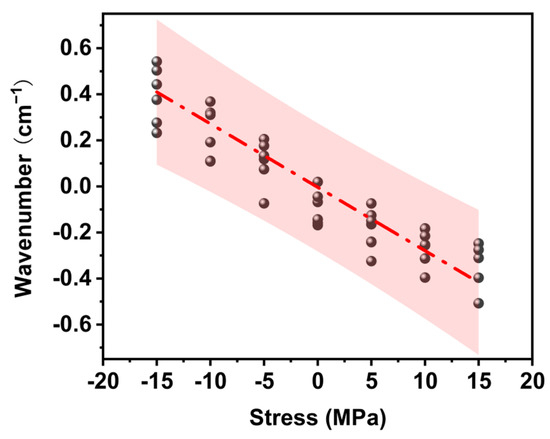 where ∆ν represents the peak shift; ∆σ represents the stress; νσ and ν0 are the peak positions with and without applied stress, respectively; and Sσ is the Raman mechanical coefficient. In the uniaxial tensile approach, a small uniaxial tensile platform is used to apply tensile load to the epoxy resin, and the laser is focused on the sample surface to obtain the Raman spectrum. Figure 4 shows the peak shift diagram of EP-Ss. The peak shift reflected the difference in the relative peak positions before and after the application of stress. The absolute value of the peak shift decreased linearly with the increase in the load. When an external compressive stress load was applied, owing to the shortening of the molecular bond length, the vibration frequency increased, and the spectral band shifted in the high-frequency direction (the wave number becomes larger); conversely, when the epoxy resin was subjected to a tensile stress load, the spectral band shifted in the low-frequency direction (the wave number became smaller). A regression line was obtained by the least square approach, and all the data points were located within the 95% prediction interval.