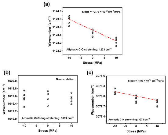(a) Raman frequency shift–stress relationship diagram of the 1223 cm−1 aliphatic C-O stretching vibration peak. (b) Raman frequency shift–stress relationship diagram of the 1619 cm−1 aliphatic C=C stretching vibration peak. (c) Raman frequency shift–stress relationship diagram of the 3078 cm−1 aliphatic C-H stretching vibration peak.