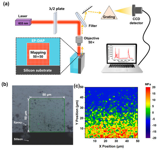 - Abiko, K.; Kato, Y.; Hohjo, H.; Kishida, Y.; Sudo, E. Raman imaging of residual stress distribution in epoxy resin and metal interface. J. Raman Spectrosc. 2020, 51, 193–200. [Google Scholar] [CrossRef]