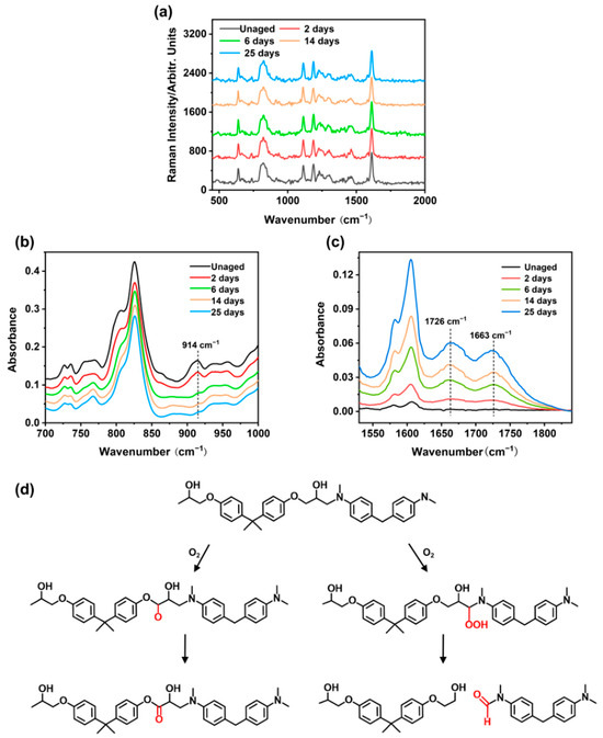 Under dry conditions, the cured EP-SW was exposed at 105 °C for 25 days and detected regularly using RAS and ATR-FTIR, respectively. As shown in Figure 7a, the characteristic peaks of epoxy resin at different aging times are basically consistent, which does not prove that the epoxy resin undergoes thermal degradation reaction. This phenomenon may be due to the fact that thermal degradation of polymer produced polar groups, whereas RAS was only sensitive to non-polar groups in the molecular chain. To demonstrate that the polymer undergone thermal degradation during thermal aging, ATR-FTIR was used to characterize the epoxy resin. In Figure 7b, the 914 cm−1 band corresponded to the epoxy group, and the peak height of the band gradually decreased and disappeared with the extension of high-temperature loading time, which could be attributed to the secondary cross-linking of the epoxy resin during the thermal aging process. As shown in Figure 7c, the detection of the epoxy amine infrared fingerprint region showed that the main changes caused by thermal oxidation occurred in two peaks within the wave number range of 1570–1860 cm−1. The peak at 1663 cm−1 usually came from the amide group created by aging on the molecular chain. The band at 1726 cm−1 usually came from the vibration of the carbonyl group produced by auto-oxidation [27]. The schematic diagram of the thermal degradation mechanism of epoxy resin is shown in Figure 7d. The growth of both bands was referred to the thermo-oxidative degradation of the epoxy chains.