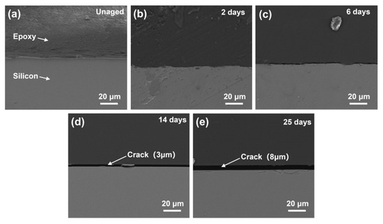 The interface position between epoxy resin and silicon wafer with different thermal aging times was observed using scanning electron microscopy. Before thermal aging, the epoxy resin at the interface was fully bonded to the silicon wafer without any cracks, indicating the formation of a strong and stable composite structure. When the sample was baked at 105 °C for 14 days, although the interface was still relatively flat, a small crack appeared at the interface. This phenomenon indicated that RS within the matrix have an impact on the morphology of the interface. After 6 days of aging, a crack with a width of 3 μm was formed at the interface position, as shown in Figure 8. This might be due to the increase in the cross-linking density of the epoxy-resin matrix during secondary curing, resulting in shrinkage stress at the interface, making the epoxy resin unable to withstand high stress and peel off to form cracks. After 25 days, the crack significantly expanded, indicating that the RS of the material continuously accumulated and led to the further expansion of the crack.