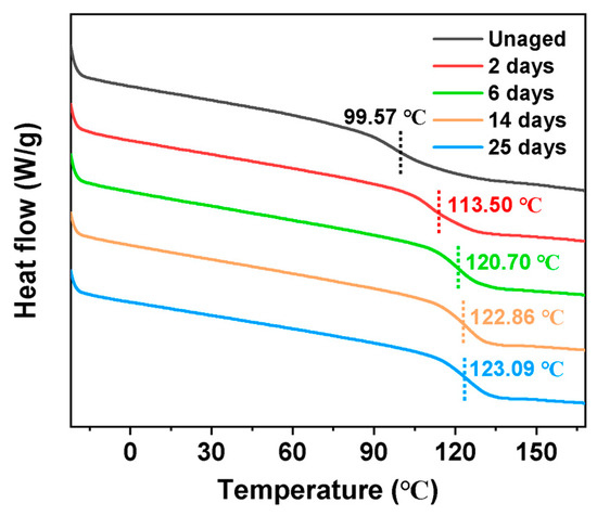 DSC curves of different aging times are shown in Figure 9. Endothermic reactions were observed in EP-SWs both before and after thermal aging over a wide temperature range, and differences existed between the glass transition temperatures of aged and nonaged epoxies. The obvious glass transition temperatures (Tgs) were 99.57 °C, 113.50 °C, 120.70 °C, 122.86 °C, and 123.09 °C for the samples that were not aged, aged for 2 d, aged for 6 d, aged for 14 d, and aged for 25 d, respectively. It can be observed that the Tg of the whole system gradually increased with the increase in aging time, and that the Tg value tended to be stable after 14 d of aging, which is considered to be the result of the joint action of cross-linking and chain-breaking effect of epoxy resin [28].
