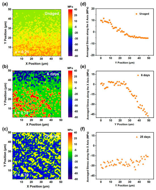 To compare the stress change trends in the depth direction of the interfaces (Y-axis) of different aging times of EP-SW, we averaged the relative stresses on the surfaces of the epoxy resins in the X-axis direction. As shown in Figure 10d, the RS increased as the distance to the silicon interface decreased, and a tensile stress of 9.9 MPa was detected on the resin surface. With the increase in the time of the thermal aging process, the RS at the interface further accumulated, and the shrinkage stress formed inside the matrix gradually intensified. Finally, in the epoxy resins shown in Figure 10e,f, the average shrinkage stress on the resin surface of the entire area was approximately 25.5 MPa. The above results further confirm that the formation and expansion of cracks was caused by the increase in the shrinkage stress inside the matrix.
