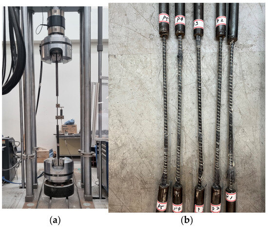 The tensile strength test was performed using a servo-hydraulic tensile strength testing machine with a capacity of 1.2 MN, and the loading rate was set at 5 mm/min. Figure 2a provides an overview of the tensile strength test.