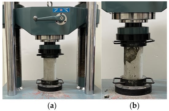 A compressive strength test was conducted to analyze the mechanical properties of the concrete. The specimen dimensions were 100 mm in diameter and 200 mm in length, and a universal testing machine with a load capacity of 1000 kN was used. The loading rate was set at 1 mm/min. Figure 4a illustrates the compressive strength test, while Figure 4b depicts the failure modes of the concrete. The results of the compressive strength test are presented in Table 3.