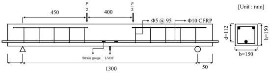 The factors that influence the bond strength between concrete and CFRP (such as the type of bar, surface treatment, and concrete cover) also impact the global behavior of the beam. This aspect is critical, especially in service conditions, in terms of crack width and deflection. Specimens were fabricated to examine the effects of CFRP rebar in concrete exposed to a chloride environment. We examined the behavior of reinforced concrete beams to determine the effects of CFRP rebar on their performance under these conditions. Chloride specimens were fabricated as concrete beams measuring 1400 mm in length, 150 mm in width, and 150 mm in height, as illustrated in Figure 5. The compressive strength of the concrete was 56.24 MPa, and D10 CFRP rebar was used for reinforcement. All sections, except the flexural section, were reinforced against shear with D8 rebars spaced at 95 mm intervals.