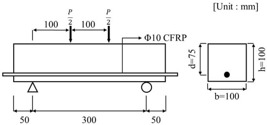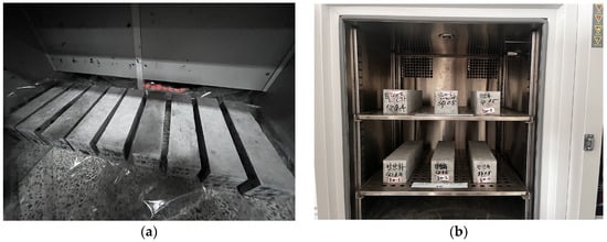 Carbonation specimens were fabricated in accordance with KS F 2584 [23], with dimensions of 400 mm in length, 100 mm in height, and 100 mm in width, as illustrated in Figure 6. The flexural specimens were reinforced with CFRP at the center, with a cover thickness of 25 mm.