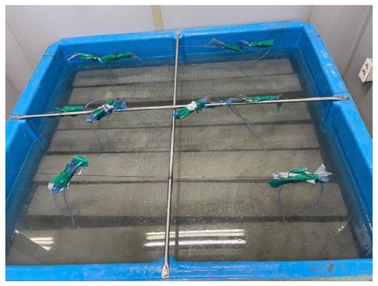 Chloride exposure duration was designated as a variable to assess the durability of concrete specimens reinforced with CFRP rebar in a chloride environment. The exposure periods were 35 and 70 d, with two specimens fabricated for each duration. Similarly to a marine environment, the specimens were immersed in a container with a 10% NaCl solution, as shown in Figure 7. The temperature was maintained at room temperature (20 °C), and to prevent changes in concentration due to evaporation, the container was refilled with water throughout the immersion period.