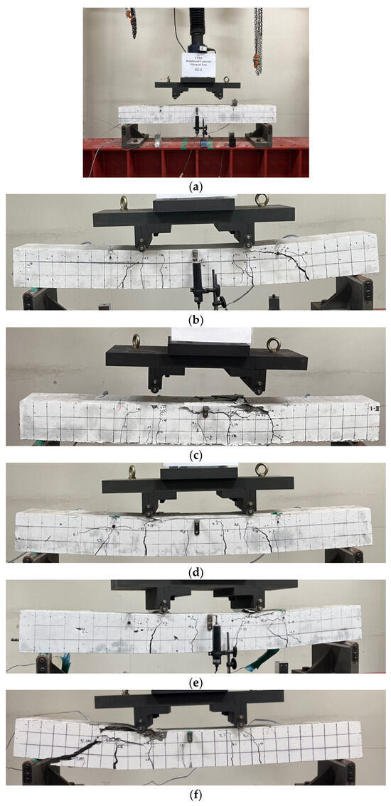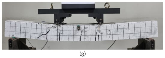 To assess the durability of concrete specimens reinforced with CFRP rebar in a chloride environment, a four-point loading test was conducted, as shown in Figure 9a. The loading rate was 0.5 mm/min, and two strain gauges were embedded in the D10 carbon reinforcement to measure strain in the pure flexural section. As a result, flexural failure occurred in most specimens, as shown in Figure 9b–g.