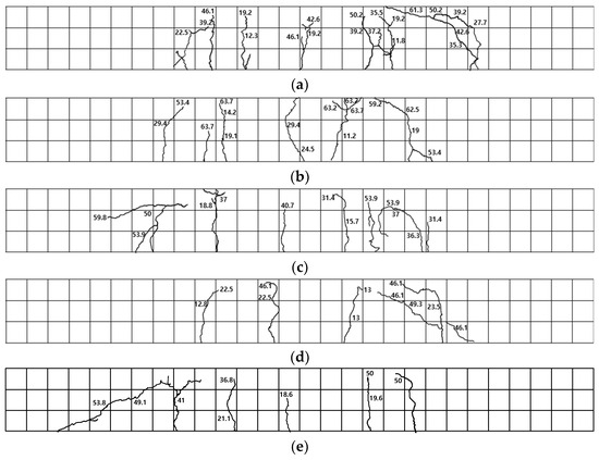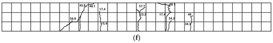Specimen CH70-1, exposed to a chloride environment for 70 d, exhibited shear failure after flexural cracking in the pure flexural section, without reaching the upper section of the concrete, as shown in Figure 10e. Specimen CH70-2 showed initial cracking in the lower left section, followed by flexural cracks in the central region and lateral sides, which progressed upwards.