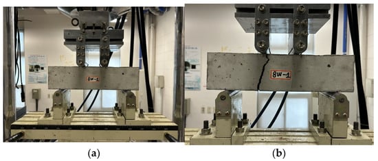 The flexural strength test for the carbonated specimen was conducted using a four-point loading method at a rate of 5 mm/min, as shown in Figure 11a. Each specimen experienced flexural failure, as depicted in Figure 11b.