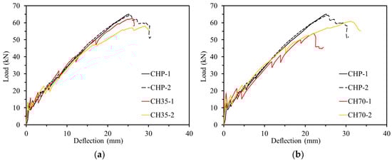 Load–deflection relationship of chlorine experiment. (a) Specimens exposed for 35 days; (b) specimens exposed for 70 days.