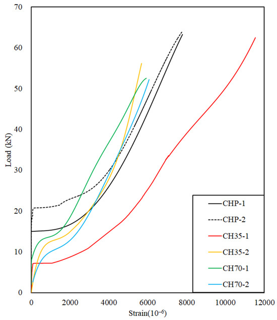 Specimen CH35-1 began initial deformation at 6.5 kN, exhibiting a lower slope compared to the CHP specimens, resulting in greater strain, and it ultimately fractured at 62 kN.