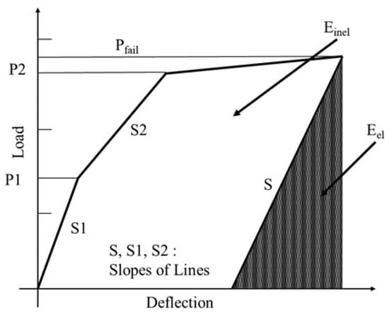 Naaman and Jeong [24] proposed the ductility index equation with an energy-based model to evaluate the ductility of FRP-reinforced concrete, and their method was employed in this study. The ductility index is not defined simply as the ratio of deflection, but as the ratio of elastic energy (Eel) to inelastic energy (Einel). Here, in Figure 14, the elastic energy can be estimated from unloading experiments, or in the absence of data, it is calculated as the area of the triangle formed by the weighted average slope of the first two straight sections of the load–deflection curve.