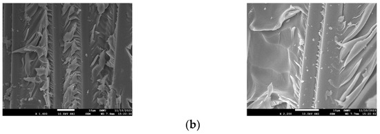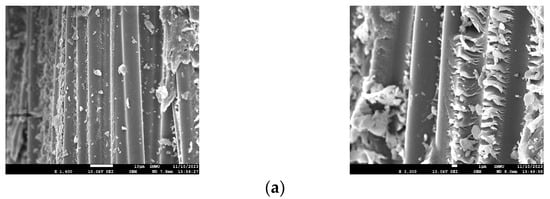 An SEM analysis was performed to observe the microstructural changes in the CFRP rebar of the carbonated specimens, and the results are shown in Figure 18.