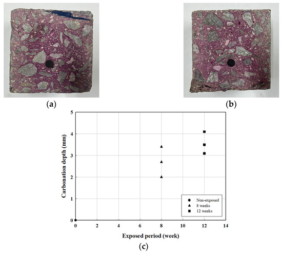 The carbonation depth of the specimen was measured according to the carbonation process. Measurements were conducted in accordance with KS F 2596 [25]. Figure 17a,b show the application of phenolphthalein solution on the fractured surfaces of the C8 and C12 specimens for carbonation depth measurement, while Figure 17c illustrates the carbonation depth over time. Table 7 presents the results of the carbonation depth and rate measurements. For carbonation prediction, Equation (4) was used [26,27,28], and the carbonation rate was determined using