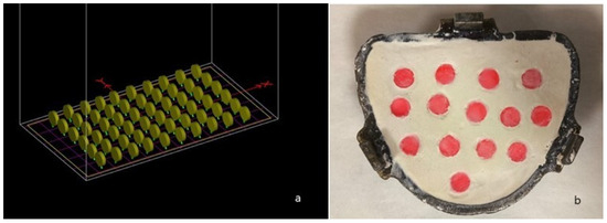 Specimens placed in the slicing software for 3D printing (a); specimens prepared in the flask for production using the conventional method (b).