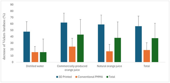 The main effect of the material, excluding the solution factor, was found to be statistically significant for the decrease in Vickers hardness (%) (p < 0.001). The mean decrease in Vickers hardness (%) was 56.24 for the 3D-printed material, whereas it was 18.93 for the conventional PMMA. The main effect of the solution, excluding the material factor, was also statistically significant for the decrease in Vickers hardness (%) (p = 0.029). The highest mean decrease in Vickers hardness (%) was observed in commercial orange juice, while the lowest mean decrease was found in distilled water. Further, the mean decrease in Vickers hardness (%) differed between distilled water and commercial orange juice, while the values for natural orange juice were similar to those in the other two solutions. The interaction between material and solution was not statistically significant for the decrease in Vickers hardness (%) (p = 0.492). A comparison of the decrease in Vickers hardness (%) based on material and solution is presented in Table 2, with descriptive statistics in Table 3. The mean decrease in Vickers hardness (%) according to the material and solution is illustrated in Figure 5.