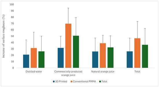 The highest increase in surface roughness (%) was observed in the interaction between conventional PMMA and commercial orange juice (69.83%), while the lowest increase was seen in the interaction between 3D-printed material and distilled water (20.96%). A comparison of the increase in surface roughness (%) based on material and solution is presented in Table 4, with descriptive statistics in Table 5. In addition, the mean increase in surface roughness (%) according to material and solution is illustrated in Figure 6.