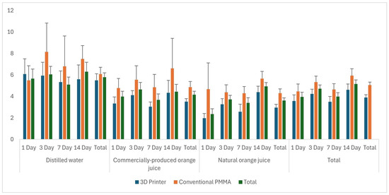 The highest ΔE value for the material and solution interaction was observed in the conventional PMMA group immersed in distilled water (6.09), while the lowest was in the 3D-printed PMMA group immersed in natural orange juice (2.96). In terms of the solution and time interaction, the highest ΔE value was recorded on day 14 in the distilled water group, while the lowest was observed on day 1 in the natural orange juice group. A comparison of ΔE values based on material, solution, and time is presented in Table 6, with descriptive statistics in Table 7. In addition, the mean ΔE values according to material, solution, and time are illustrated in Figure 7.
