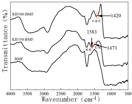 FTIR was performed on the neat basalt microfibers (BMFs) and surface-modified basalt microfibers (KH550-BMF or KH560-BMF). The obtained spectrum is shown in Figure 1, and the infrared characteristic absorption of the silane coupling agents’ molecules could be observed. Compared to BMF, new bond formations were observed in the KH550-BMF and KH560-BMF. As can be seen in Figure 1, there are absorption peak at 3420 cm−1 and 2900 cm−1 in the FTIR spectra of all specimens, which can be assigned to the stretching vibration of hydroxy groups. The peak at 1583 cm−1 on the KH550-BMF curve could be ascribed to the bending vibration of N-H, while the peak at 1473 cm−1 could be attributed to the bending vibration of C-H in KH550 chains. The characteristic absorption peak at 1420 cm−1 corresponds to the C-O-C bonds in the epoxy group of KH560. In summary, these typical peaks indicated that the surface modification of basalt microfibers was successful.