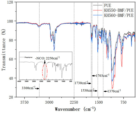Figure 2 displayed the FTIR spectrum of uncoated BMF/PUE and modified BMF/PUE composites (KH550-BMF/PUE and KH560-BMF/PUE). The peak at 3300 cm−1 was due to N-H stretching vibration. The peaks at 1730 cm−1 and 1703 cm−1 were characteristic of ester carbonyl. The one at 1530 cm−1 was the characteristic absorption peak of C-N-H bending vibration. The peak at 1370 cm−1 was attributed to the symmetrical deformation vibration of the methyl groups, and no obvious splitting was seen. This indicated that there was barely branching in the molecular chains. There were no apparent absorption peaks, such as -NCO characteristic absorption peak (see from the inset graph of prepolymer, 2250 cm−1). The absence of isocyanate signal indicated that the reaction was fairly complete. Therefore, almost no side reaction was observed within the synthesis of designed composites.