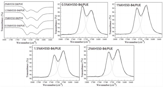 FTIR spectra of the carbonyl part of KH550-B4/PUE composites and Gauss–Lorentz peak splitting results.