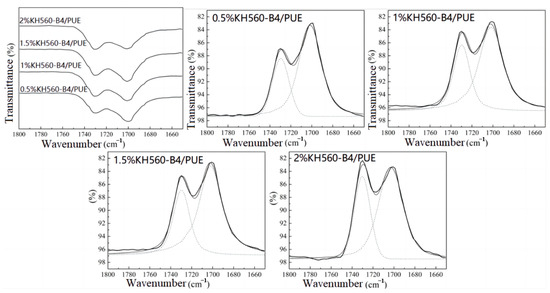 FTIR spectra of the carbonyl part of KH560-B4/PUE composites and Gauss–Lorentz peak splitting results.