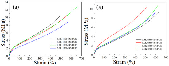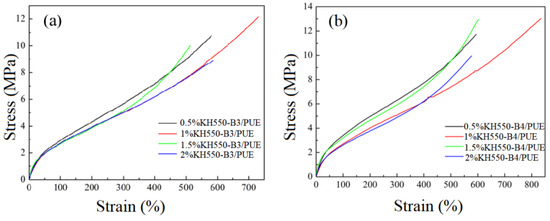 Stress–strain curves of PUE matrix and different composites with (a) KH560-B3/PUE and (b) KH560-B4/PUE.