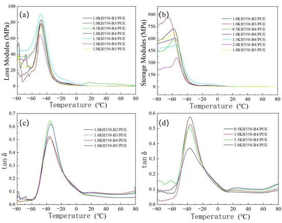 Loss modulus, storage modulus, and loss factor curve of KH550 BMF/PUE composites: (a) loss modulus, (b) storage modulus, and (c,d) loss factor of different KH550 BMF/PUE composites.