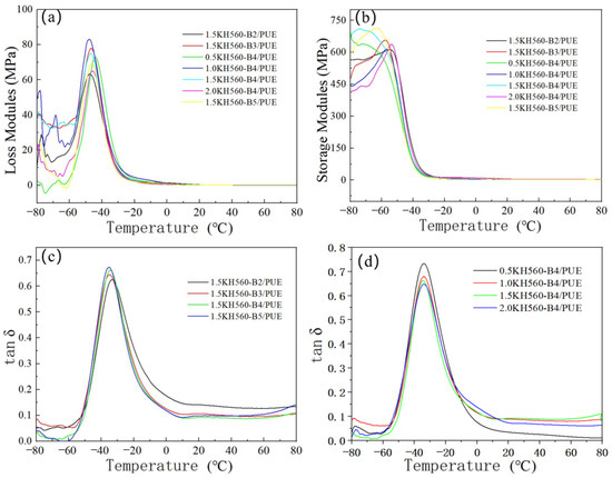 Loss modulus, storage modulus, and loss factor curve of KH560 BMF/PUE composites: (a) loss modulus, (b) storage modulus, and (c,d) loss factor of different KH560 BMF/PUE composites.