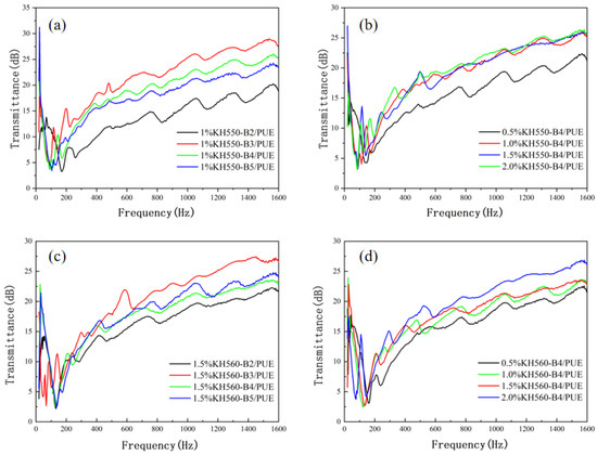 Transmission loss curves from 0 to 1600 Hz for different modified BMF/PUE composites: (a) 1% KH550 with different ball milling time, (b) same milling time with different KH550 content, (c) 1% KH560 with different ball milling time, and (d) same milling time with different KH560 content.